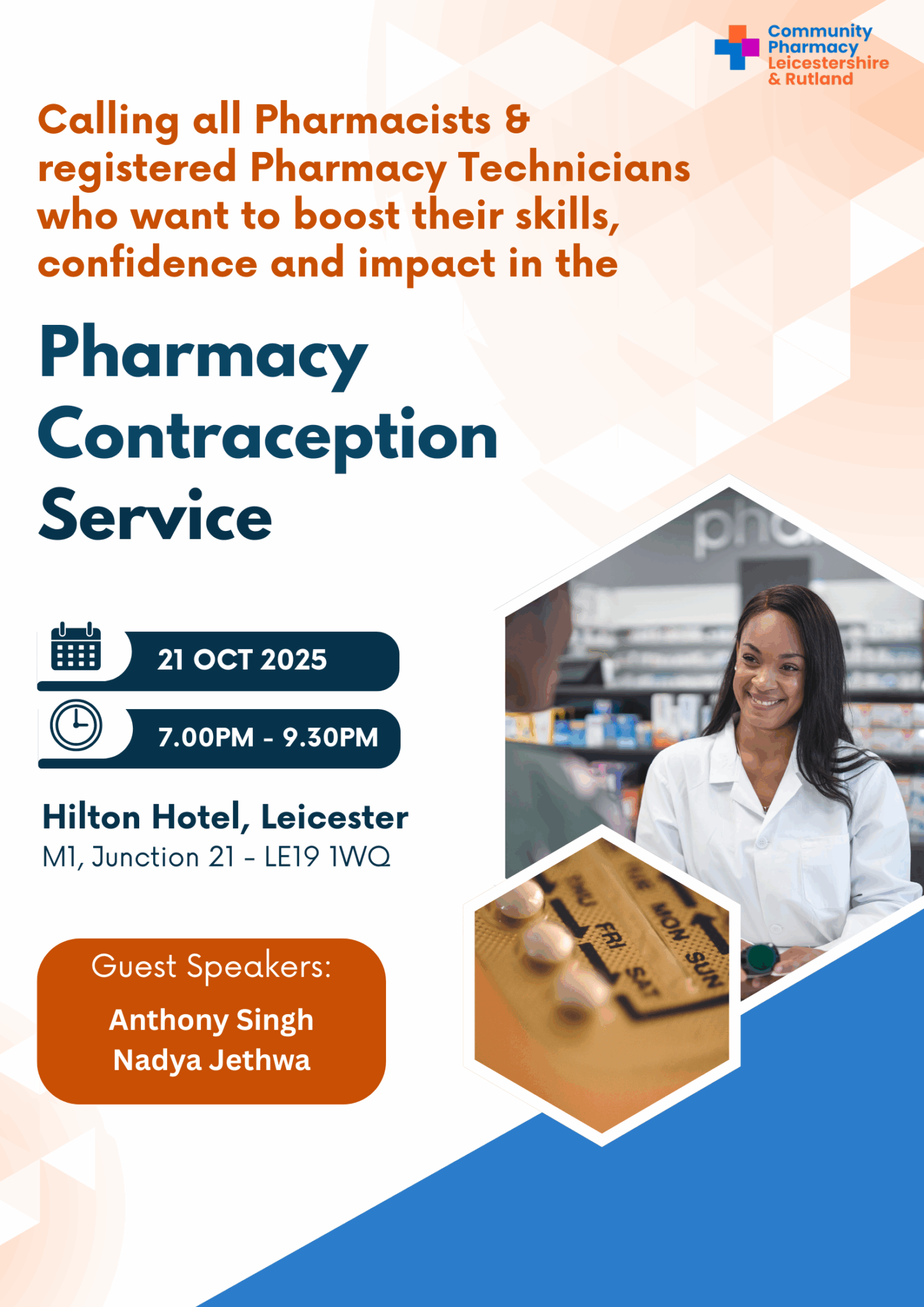 📅 Pharmacy Contraception Service Training Event Date: Tuesday 21st October 2025 Venue: Hilton Leicester, M1 J21 – LE19 1WQ Time: 7:00pm (Dinner on arrival) | 7:45pm prompt start | 9:30pm close Agenda • Overview of the NHS Community Pharmacy Contraception Service • Understanding the Upcoming Service Changes • Guest Speaker 1 Anthony Singh (Clinical Pharmacist ) –Delivering High-Quality Contraception Consultations • Guest Speaker 2: Nadya Jethwa (Community Pharmacist) – Creating a Service-Driven Pharmacy: ✅ Open to all Community Pharmacists and Technicians in Leicester, Leicestershire & Rutland.