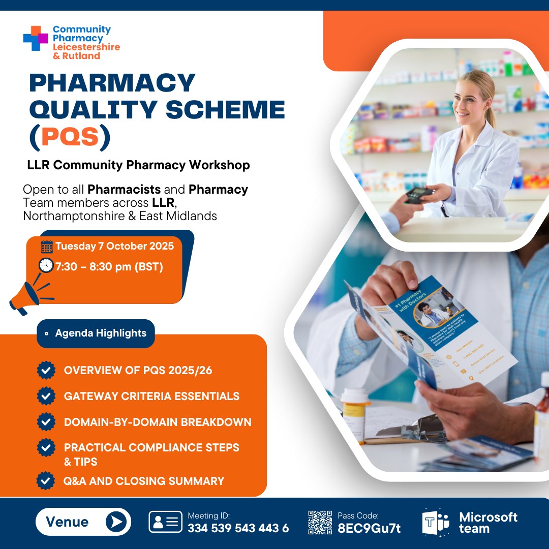 📢 PQS Webinar – LLR Community Pharmacies We’re delighted to invite you to our Pharmacy Quality Scheme (PQS) webinar, supporting all LLR Community Pharmacies in managing and working through this year’s initiative. 📅 Date: Tuesday 7th October 🕢 Time: 7:30 pm 💻 Platform: Microsoft Teams 👉 Join the meeting: Click here to join now Meeting ID: 334 539 543 443 6 Passcode: 8EC9Gu7t