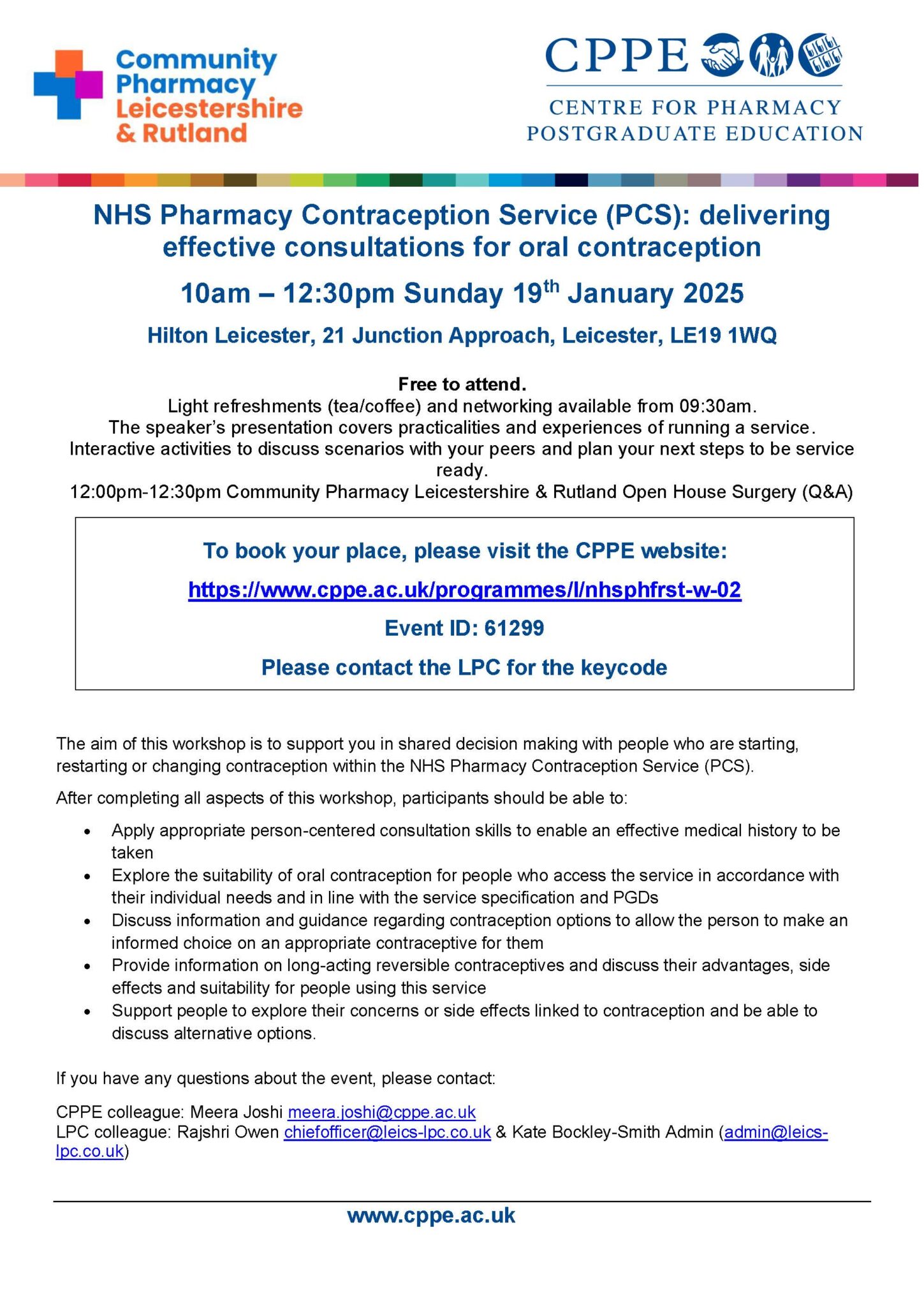 NHS Pharmacy Contraception Service Leicestershire and Rutland January workshop flyer v2